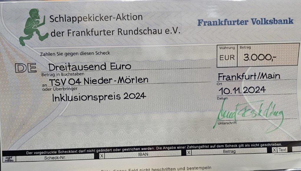 Seit 1997 wird der Inklusionspreis der Schlappekicker-Aktion der Frankfurter Rundschau e. V. verliehen. Die Wahl wird vor ab von einem Gremium getroffen, die Vereine suchen, die im Bereich Inklusion gute Arbeit leisten. Dann wird vom Vorstand entschieden wer zu den Preisträgern gehören soll. Dieses Jahr gingen die vier Einladungen/Preise an den SC Frankfurt 1880 Specialhockey, Gemeinsam mit Behinderten e. V. Rodgau, Tennis for all Tennis u. Eissportverein Kelkheim und den TSV 1904 Nieder-Mörlen e. V. Trampolinturnen!